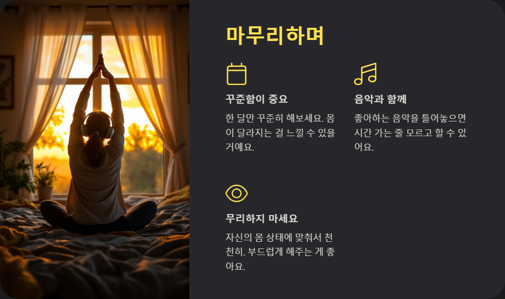 여러분, 오늘부터 꼭 스트레칭 시작해보세요! 처음엔 시간도 좀 걸리고 귀찮을 수 있어요. 근데 한 달만 꾸준히 해보세요. 몸이 달라지는 걸 느낄 수 있을 거예요. 더 유연해지고, 운동할 때 더 편안함을 느낄 수 있을 거예요.