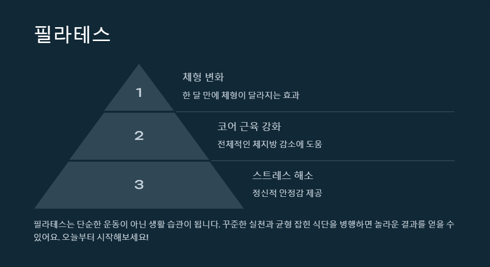 제가 필라테스를 시작한 지 한 달 만에 체형이 달라지는 걸 느꼈어요. 특히 코어 근육을 강화시켜주기 때문에 전체적인 체지방 감소에 도움이 돼요. 게다가 스트레스 해소에도 정말 좋더라고요. 한 번 빠지면 헤어 나올 수 없을 걸요?